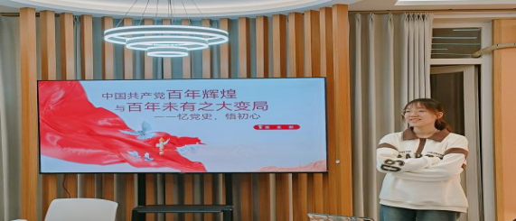 郝佳薇从“中国共产党的百年辉煌业绩”、“中国共产党的百年未有之大变局”、“百年辉煌为应对百年大变局提供重要条件”三个方面讲述了百年辉煌党史与百年未有之大变局。与会党员围绕党课内容,结合自身学习生活实际进行深入的交流探讨。