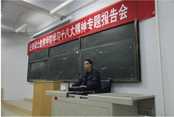 师生作了主题为“学习十八大精神”的专题报告会。法律硕士教育学院院长韩汉卿、党委书记黄发建、党委副书记张学龙、团委书记王聪、学生辅导员马军强及法律硕士教育学院全体党员及部分学生代表共计300余人参加了集中学习活动。
