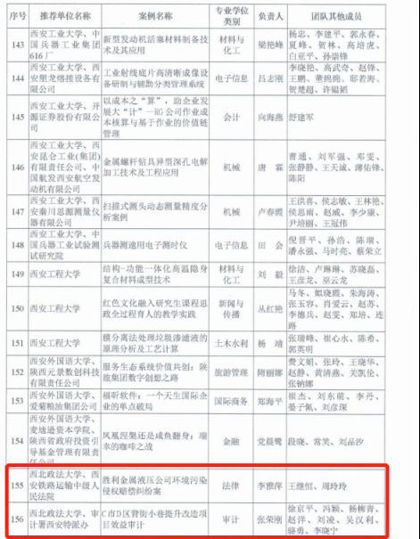 我校由张荣刚主持,徐京平、冯颖、杨柳青、赵洋、刘凌、吴汉利、骆勇、李晓宁参与的教学案例《C市D区背街小巷提升改造项目审计》和由李雅萍主持,王继恒、周玲玲参与的教学案例《胜利金属液压公司环境污染侵权赔偿纠纷案》同时入选为第二批陕西省专业学位研究生教学案例入库名单。