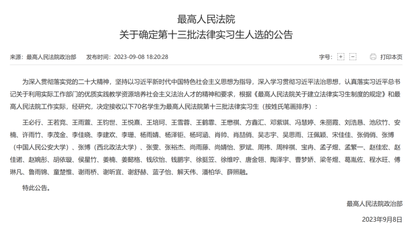 近日,最高人民法院公布了第十三批法律实习生人选名单,赌场 有3名研究生成功入选,分别是法学理论专业2021级硕士研究生王雪蓉、法律(法学)专业2022级硕士研究生赵佳宏、法律(法学)专业2022级硕士研究生蓝子怡。