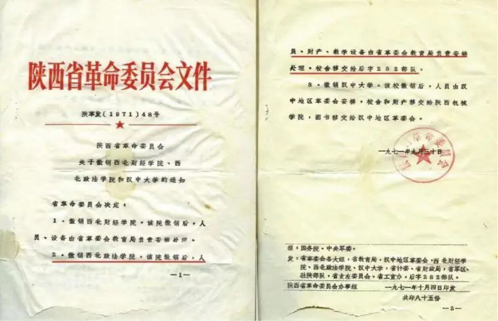 1971年9月30日,陕西省革命委员会以“陕革发[1971]48号《陕西省革命委员会关于撤销西北财经学院、西北政法学院和汉中大学的通知》,决定撤销西北政法学院。通知明确规定,学校撤销后,人员、财产、教学、设备由陕西省革委会教育局负责安排处理,校舍全部移交给总后232部队。1971年8月、9月间,全校教职工和家属已全部从白水县返回西安。全体教职员工266人于1972年上半年分配到其他高等院校、省属企业和外省区。据统计,分配至陕西师范大学、西安交通大学、西安外国语学院、西安冶金建筑学院、陕西中医学院、西北大学、西安医学院、西北工业大学等共168人,省内企事业单位陕西重型机械厂、红旗手表厂、关山机械厂等共27人,外省区53人,另有18人在学校留守处工作,处理停办期间学校相关事宜。1974年,陕西省革委会教育局指示,将学校积累了几十年的二十多万册图书、设备悉数调送给今天的延安大学。其实,1970年冬天,恢复创办于1958年的延安大学差点也被撤销,后来在周恩来总理的亲自关怀下得以保留,周总理亲自批示延安大学不仅要办,而且还要办大办好。西北政法学院的文献设备被调配给了延安大学,让根脉相连的两所学校情缘更深。