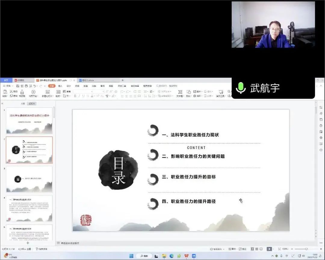 武航宇教授围绕法科学生职业胜任力现状、影响职业胜任力的关键问题、职业胜任力提升的目标以及职业胜任力的提升路径四个方面开展本次讲座。