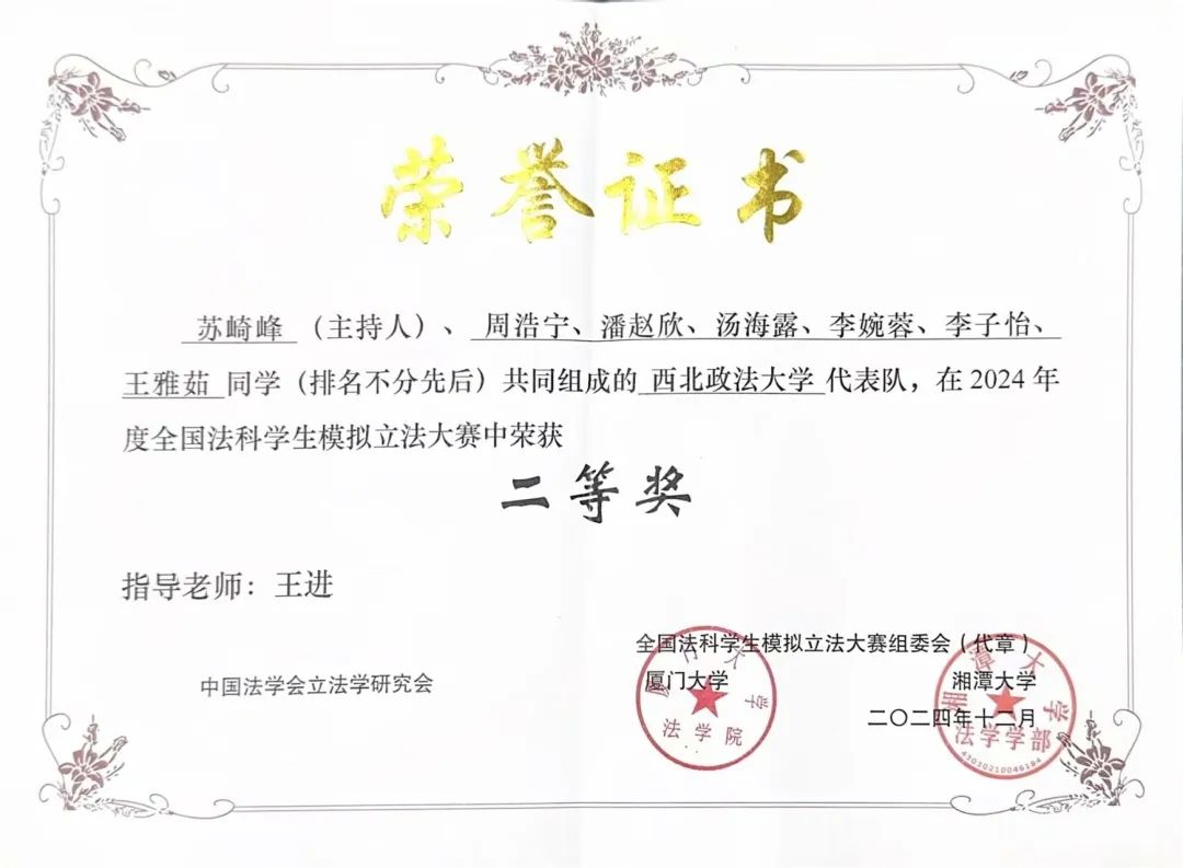 2024年12月,由中国法学会立法学研究会主办的全国法科生模拟立法大赛落下帷幕。在来自全国173所高校的激烈角逐中,由赌场 王进老师指导的团队,凭借《陕西省新就业形态劳动者权益保障条例(草案)》斩获全国二等奖,是我校参与全国法科生模拟立法大赛以来最好的成绩。