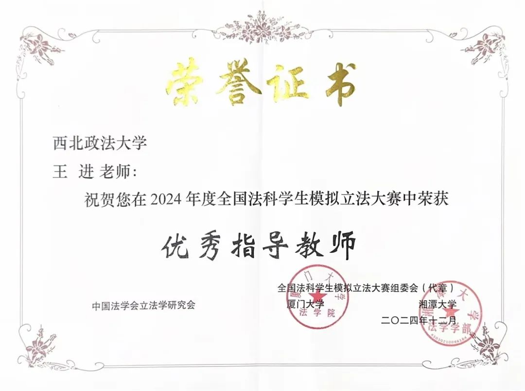 自开赛公告发布以来,全体成员在王进老师的指导下有序备赛,聚焦党的二十大精神和习近平法治思想,充分调研本省新就业形态行业现状,多次召开会议共同研讨,仔细梳理立法资料,反复打磨草案条文,最终形成了参赛作品《陕西省新就业形态劳动者权益保障条例(草案)》及论证材料,并荣获本次立法大赛的“优秀指导教师”称号。