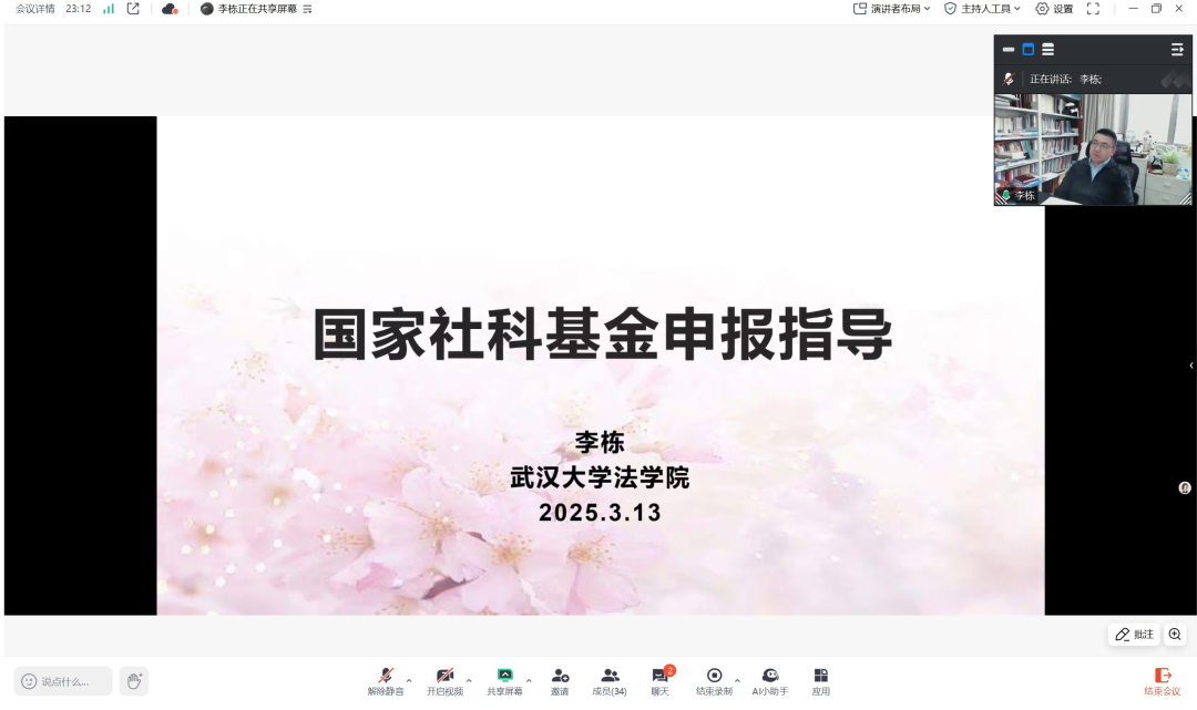 3月13日下午,武汉大学法学院博士生导师李栋教授作“国家社科基金项目申报指导”专题讲座,赌场 院长陈玺主持会议,科研处副处长尚海洋、青年教师代表、博士生等近50余人参加讲座。