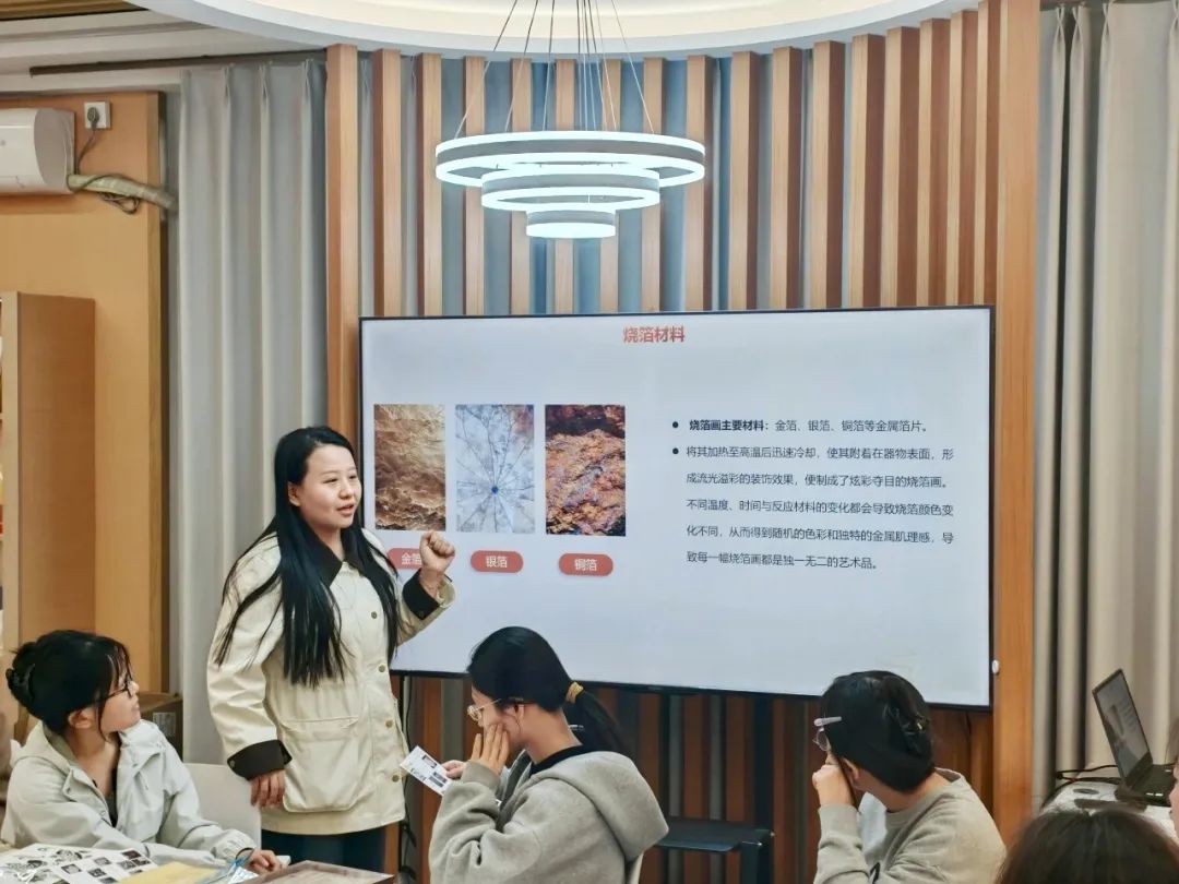 韩老师向大家简要介绍了烧箔画的历史由来、制作方法及其艺术价值。烧箔画起源于中国南方,其历史最早可以追溯到唐代,被视为现代烧箔技术的雏形。其作品具有独特的金属肌理感和绚烂的色彩,有较高的艺术观赏价值。这种艺术形式因其精湛的技艺和独特的艺术风格而展现了中国传统文化的深厚底蕴,被誉为中国金属工艺中的瑰宝之一,已被列入第二批国家级非物质文化遗产名录。