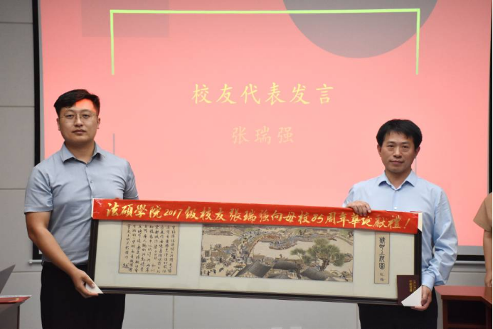 接着,校友代表北京市中伦文德(郑州)律师事务所张瑞强先生发言表示了作为远游学子重新回到母校参加校庆活动的激动心情,向母校捐赠一副汴绣表达归家游子的一份拳拳之心,并深切的祝愿母校继续身如长虹,为西北地区乃至全国培养和输送出更多更加杰出的法治人才。